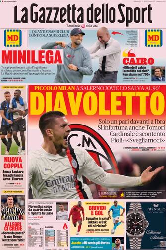 - Apertura con titolo "Diavoletto". Piccolo Milan a Salerno: Jovic lo salva al 90'. Solo un pari davanti a Ibra. Si infortuna anche Tomori e Cardinale è scontento. Pioli: "Svegliamoci"