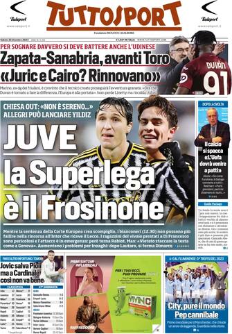 - Apertura con titolo "Juve, la Superlega è il Frosinone". Chiesa out: "Non è sereno". Allegri può lanciare Yildiz