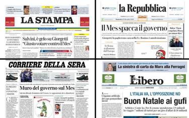 Sulle prime pagine di oggi dei principali quotidiani il no del Parlamento alla ratifica del Meccanismo europeo di stabilità (Mes). Tra le notizie anche l'emergenza migranti e la guerra in Medio Oriente