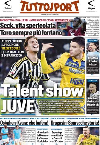 - Apertura con titolo "Talent show Juve". Alle 21 contro il Frosinone Yildiz e Soulé: i jolly di Allegri e Di Francesco. Spazio a "Seck vita spericolata, Toro sempre più lontano"