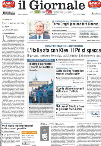 - Apertura con titolo "L'Italia sta con Kiev, il Pd si spacca". Il governo rassicura Zelensky, la Schlein no. E si astiene su tutto