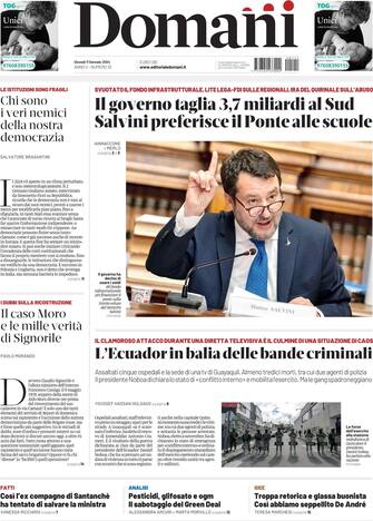 - Apertura con titolo "Il governo taglia 3,7 miliardi al Sud. Salvini preferisce il ponte alle scuole"