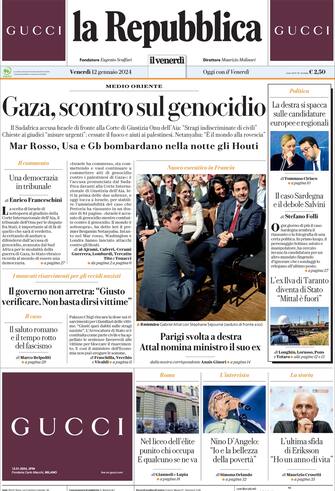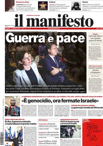 - Apertura con titolo "Gaza, scontro sul genocidio". Il Sudafrica accusa Israele davanti alla Corte di Giustizia Onu dell'Aia: "Stragi indiscriminate di civili"