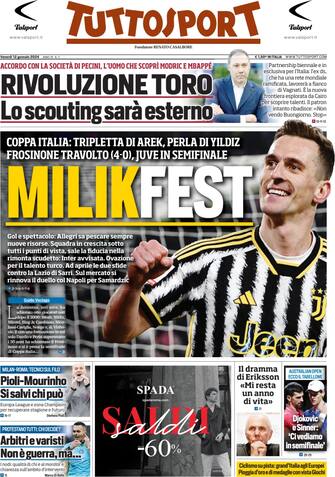 - Apertura con titolo "Milikfest". Coppa Italia: tripletta del polacco, perla di Yildiz. Frosinone travolto (4-0), Juve in semifinale