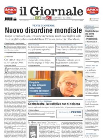 - "Nuovo disordine mondiale. Dopo Ucraina e Gaza, disordini in Yemen: raid Usa e inglesi sulle basi Houthi armati dall'Iran. E L'Islam minaccia l'Occidente" titola Il Giornale