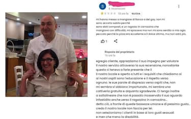 La titolare della pizzeria "Le Vignole" nei giorni scorsi aveva risposto a una recensione sul suo ristorante di un cliente che si lamentava per avere mangiato accanto a un tavolo con una coppia omosessuale e un ragazzino disabile: "Mi hanno messo a mangiare di fianco a dei gay. Non mi sono accorto subito perché sono stati composti, e il ragazzo in carrozzina mangiava con difficoltà. Mi spiaceva ma non mi sono sentito a mio agio. Peccato perché la pizza era eccellente e il dolce ottimo , ma non andrò più". Pedretti, nel cui locale si svolgono iniziative di solidarietà come la pizza sospesa per i disabili, aveva replicato: "Il nostro locale è aperto a tutti e i requisiti che chiediamo ai nostri ospiti sono l'educazione e il rispetto verso ognuno. Le sue parole di disprezzo verso ospiti che non mi sembra vi abbiano importunato mi sembrano una cattiveria gratuita e alquanto sgradevole. A fronte di queste bassezze umane e di pessimo gusto... credo che il nostro locale non faccia per lei. Non selezioniamo i nostri clienti in base all'orientamento sessuale e men che meno la disabilità. Le chiedo gentilmente di non tornare da noi a meno che non ritrovi in sé i requisiti umani che nel suo atteggiamento sono mancati". La recensione era della scorsa estate ed era stata poi cancellata, aveva spiegato Giovanna, che però ne aveva fatto uno screenshot.