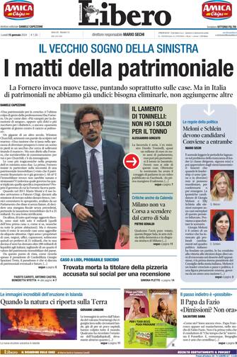 - “I matti della patrimoniale”, una nuova tassa invocata dalla Fornero. La spalla è dedicata alle elezioni europee e alla possibile candidatura di Giorgia Meloni ed Elly Schlein
