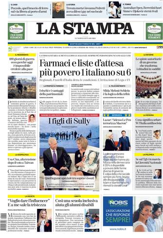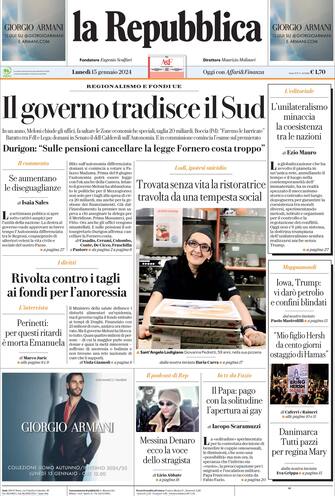 - “Farmaci e liste d'attesa, più povero un italiano su 6”, l'apertura è dedicata alla crisi sanitaria che aumenta le diseguaglianze nel Paese: sempre più persone rinunciano alle cure. La spalla è dedicata ai primi 100 giorni della guerra in Medio Oriente