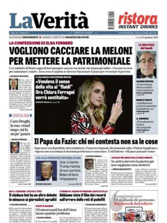 - “Vogliono cacciare la Meloni per mettere la patrimoniale”, è il titolo di apertura di oggi del quotidiano che parla di una “confessione di Elsa Fornero”. Nela taglio basso l'intervento di Papa Francesco ospite in tv da Fazio