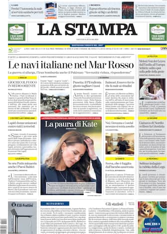 - L'apertura di oggi parla della crisi nel Mar Rosso con le navi militari italiane in azione nell'ambito della missione europea. Nella fotografica Kate Middleton operata all'addome nei giorni scorsi