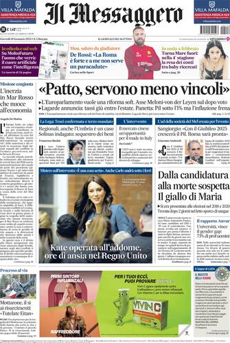 - “Patto, servono meno vincoli”, così titola oggi il quotidiano parlando dell'asse Meloni-von der Leyen sul dopo voto alle europee. Nella fotografica Kate Middleton, sottoposta a intervento chirurgico nei giorni scorsi