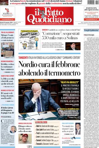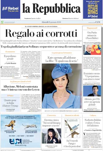 - “Regalo ai corrotti”, è il titolo di apertura di oggi che parla della riforma della giustizia del ministro Carlo Nordio. Nella fotografica Kate Middleton, sottoposta a un'operazione chirurgica all'addome nei giorni scorsi