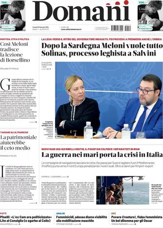 - Apertura con titolo "Dopo la Sardegna Meloni vuole tutto. Solinas, processo leghista a Salvini"