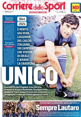 - Apertura con titolo "Unico". E' morto Gigi Riva, leggenda del calcio italiano: un campione che viveva di ideali e amava la Sardegna