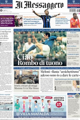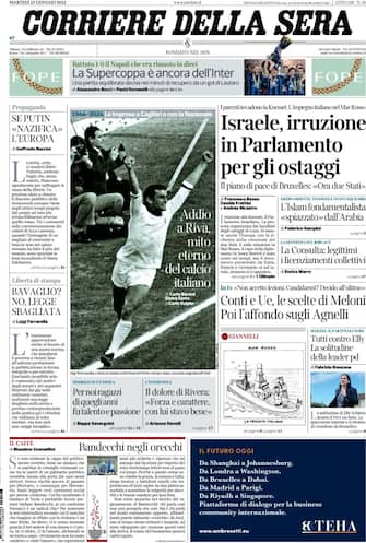 L'irruzione nel Parlamento israeliano dei parenti degli ostaggi di Hamas in apertura su alcuni quotidiani. Spazio anche al ddl sull'Autonomia differenziata che verrà approvato oggi in Senato. Unanime il cordoglio per la scomparsa, all'età di 79 anni, di Gigi Riva, simbolo dello scudetto del Cagliari nel 1970 e bomber dei bomber con la Nazionale