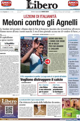 - Apertura con titolo "Meloni contro gli Agnelli". Le bordate del premier: "Hanno dato la Fiat ai francesi e lasciato che si trasferisse all'estero. Hanno messo all'asta i nostri marchi. E ora il loro giornale accusa me di vendere il paese"