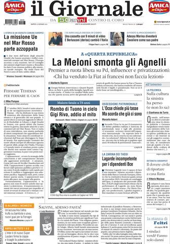 - Apertura con titolo "La Meloni smonta gli Agnelli". Premier a ruota libera su Pd, influencer e privatizzazioni: "Chi ha venduto la Fiat ai francesi non faccia lezioni"