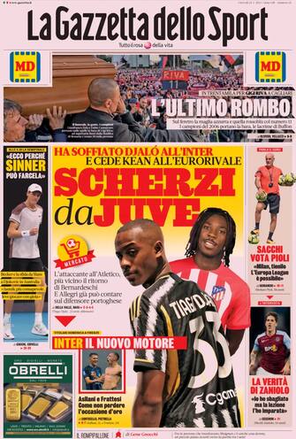- Apertura con titolo "Scherzi da Juve". Ha soffiato Djalò all'Inter e cede Kean all'Eurorivale. Spazio a "L'ultimo rombo"