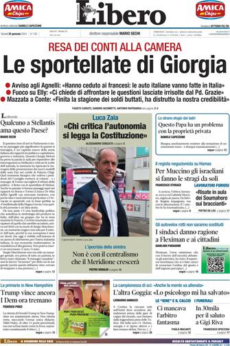 - Apertura con titolo "Le sportellate di Giorgia". Avviso agli Agnelli: "Hanno ceduto ai francesi: le auto italiane vanno fatte in Italia"
