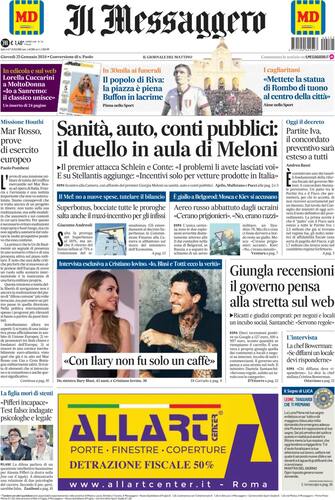 - Apertura con titolo "Sanità, auto, conti pubblici: il duello in aula di Meloni". Il premier attacca Schlein e Conte: "I problemi li avete lasciati voi"
