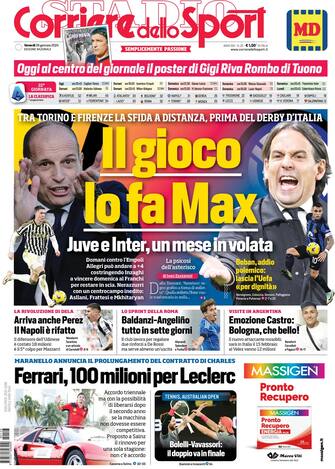 - Apertura con titolo "Il gioco lo fa Max". Tra Torino e Firenze la sfida a distanza, prima del derby d'Italia. Juve e Inter, un mese in volata