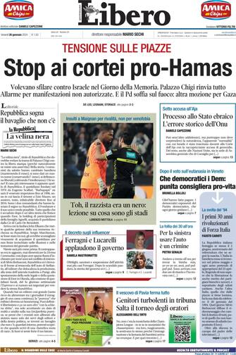 - Apertura con titolo "Stop ai cortei pro Hamas". Volevano sfilare contro Israele nel Giorno della Memoria. Palazzo Chigi rinvia tutto