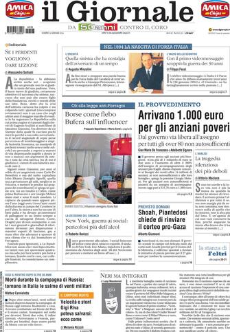 - Apertura con titolo "Arrivano 1.000 euro per gli anziani poveri". Dal governo via libera all'assegno per tutti gli over 80 non autosufficienti