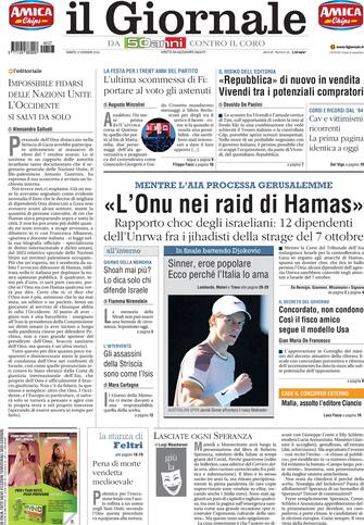 - Apertura con titolo "L'Onu nei raid di Hamas". Rapporto choc degli israeliani: 12 dipendenti dell'Unrwa fra i jihadisti della strage del 7 ottobre