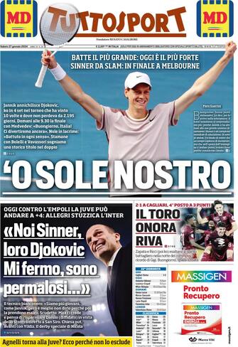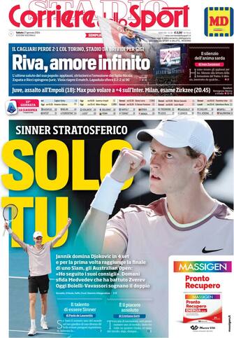- Apertura con titolo "Solo tu". Sinner stratosferico: "Jannik domina Djokovic in quattro set e per la prima volta raggiunge la finale di uno Slam