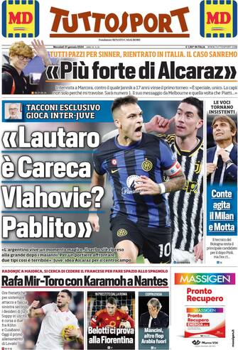 - Apertura con titolo "Lautaro è Careca. Vlahovic? Pablito". Tacconi in esclusiva gioca Inter-Juventus