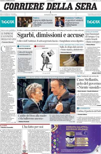 - “Fuori uno conflitto d'interessi per incarichi a gettone” è il titolo di apertura che si riferisce alle dimissioni del sottosegretario Vittorio Sgarbi. Nel taglio alto gli sviluppi della protesta dei trattori. In spalla il caso Stellantis e la guerra in Medio Oriente