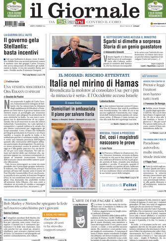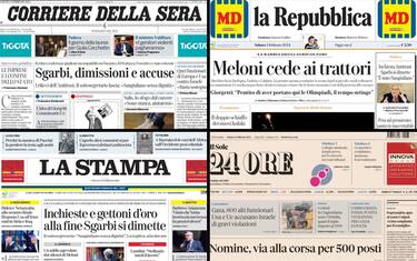 Lo scontro tra il governo e Stellantis sugli aiuti da destinare all'azienda di auto e le dimissioni di Vittorio Sgarbi da sottosegretario sono le principali notizie riportate oggi dai quotidiani italiani. Per quanto riguarda gli esteri continua a far discutere la guerra in Medio Oriente con 800 diplomatici europei e statunitensi che chiedono di fermare il conflitto e il rischio di genocidio