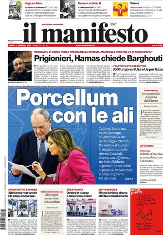 - “Porcellum con le ali” è il titolo di apertura di oggi sulla nuova legge elettorale proposta da Calderoli. Nel taglio alto la guerra in Medio Oriente con la trattativa per la liberazione degli ostaggi