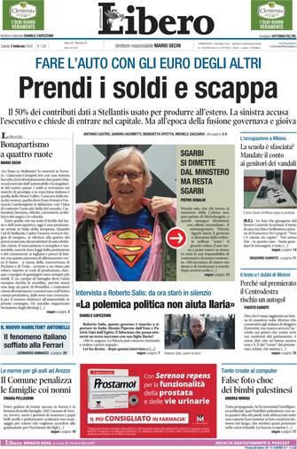 - “Prendi i soldi e scappa” è il titolo di apertura dedicato allo scontro tra il governo e Stellantis sui sussidi all'azienda per produrre all'estero. Vittorio Sgarbi si è dimesso da sottosegretario
