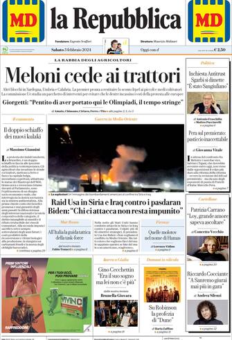 - “Meloni cede ai trattori”, la premier sarebbe pronta a restituire lo sconto sull'Irpef agli agricoltori. Nella fotografia il raid Usa in Siria e Iraq contro i pasdaran. In spalla le dimissioni di Vittorio Sgarbi