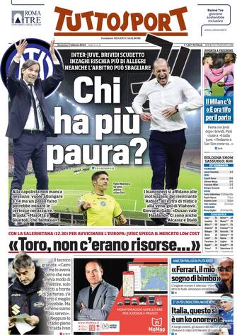 - Apertura con titolo "Chi ha più paura?" Inter-Juventus, brividi scudetto. Inzaghi rischia più di Allegri. Neanche l'arbitro può sbagliare