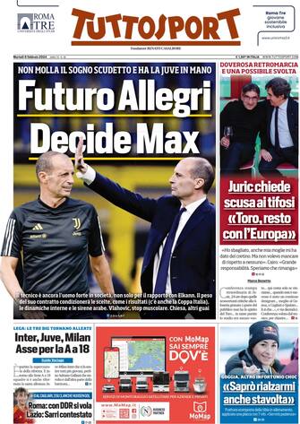 - Apertura con titolo "Fututro Allegri, decide Max". Non molla il sogno scudetto e ha la Juventus in mano