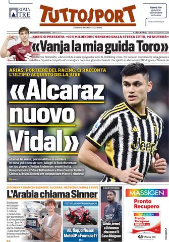- Apertura con titolo "Alcaraz nuovo Vidal". Arias, il portiere del Racing, ci racconta l'ultimo acquisto della Juventus