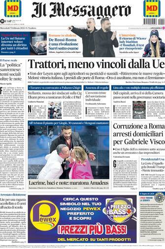 - Apertura con titolo "Trattori, marcia indietro della Ue". Amadeus e Fiorello: aspettiamo i ribelli. Nomine Rai e Fs, scontro Lega e Fratelli d'Italia