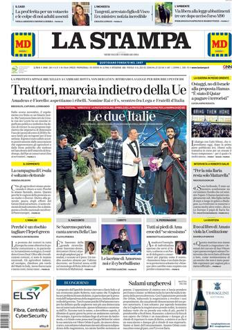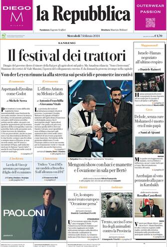 - Apertura con titolo "Trattori, la Ue cambia rotta". Gli agricoltori non fermano la protesta: i blocchi e l'obiettivo Sanremo