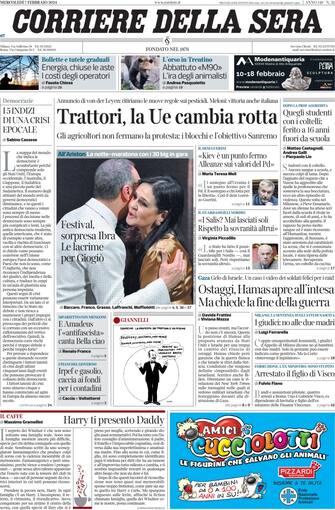- Apertura con titolo "Tutti sul trattore del vincitore". Gli agricoltori criticano il governo e il governo si schiera con i trattori. Gli agricoltori criticano l'Ue e l'Ue si schiera con i trattori. Pazzo viaggio nel nuovo festival dell'ipocrisia, anche con il cortocircuito di Sanremo
