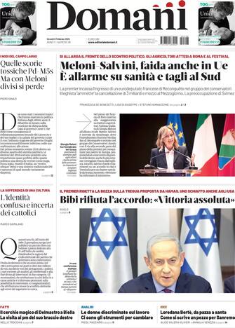 - Apertura con titolo "Meloni-Salvini, faida anche in Ue. E' allarme su sanità e tagli al Sud"