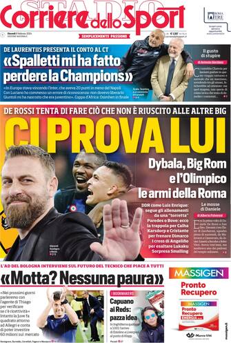 - Apertura con titolo "Ci prova lui". De Rossi tenta di fare ciò che non è riuscito alle altre big. Dybala, Big Rom e l'Olimpico: le armi della Roma