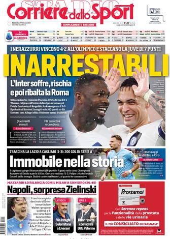 - Apertura con titolo "Inarrestabili". L'Inter soffre, rischia e poi ribalta la Roma. I nerazzurri vincono 4-2 all'Olimpico