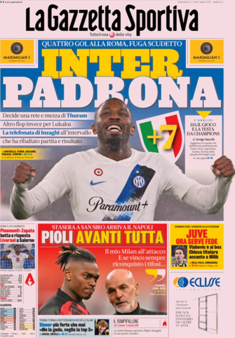 - Apertura con titolo "Inter padrona". Quattro gol alla Roma, fuga scudetto. Decide una rete e mezza di Thuram. Altro flop, invece, per Lukaku
