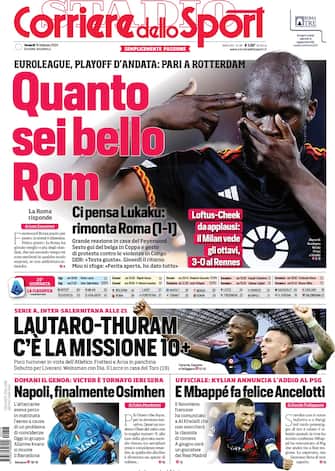 - "Quanto sei bello Rom" è il titolo d'apertura dedicato al pareggio della Roma contro il Feyenoord nell'andata dei playoff di Europa League. Taglio medio sulla Serie A, con la "missione +10 di Lautaro-Thuram" contro la Salernitana stasera. In basso, il ritorno di Osimhen al Napoli dopo le fatiche della Coppa d'Africa e l'approdo di Mbappé al Real Madrid