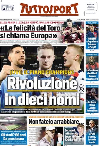 - "Juve, il piano Champions: rivoluzione in dieci nomi" è il titolo che campeggia in prima pagina. Da Zaccagni a Gudmundsson, da Koopmeiners a Samardzic: obiettivi di qualità, più i rientri dai prestiti e le promozioni dalla Next Gen, per una rosa all'altezza dell'Europa. Spazio anche alla Serie A, con il Torino che attende alle 19 il Lecce