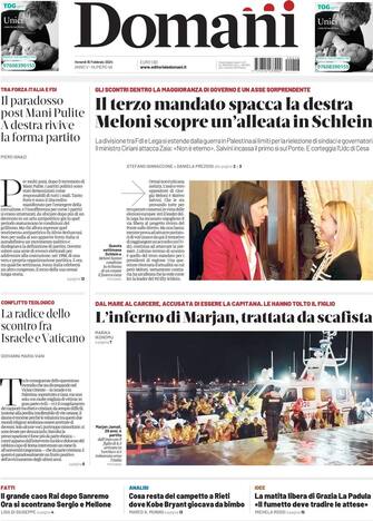 - "Il terzo mandato spacca la destra, Meloni scopre un'alleata in Schlein" è il titolo d'apertura. La divisione tra FdI e Lega si estende dalla guerra in Palestina ai limiti per la rielezione di sindaci e governatori. Il ministro Ciriani attacca Zaia: "Non è eterno". Salvini incassa il primo sì sul Ponte (e corteggia l'Udc di Cesa)