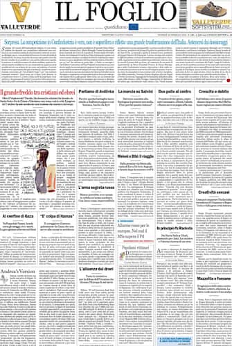 - "Sorpresa. La competizione in Confindustria è vera, non è soporifera e riflette una grande trasformazione dell'Italia. Astenersi dai dossieraggi" è il titolo d'apertura. Spazio anche a una riflessione sul "grande freddo tra cristiani ed ebrei"