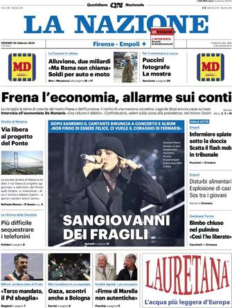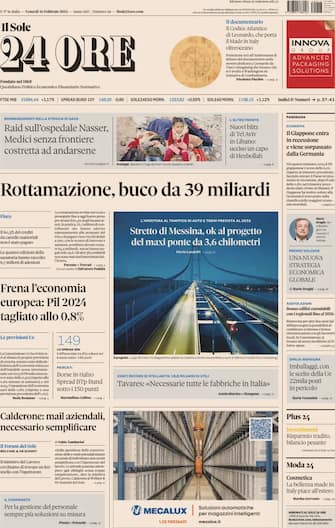 - "Frena l'economia, allarme sui conti" è il titolo d'apertura. L'Ue taglia le stime di crescita del nostro Paese e dell'Eurozona, il rischio di una manovra correttiva. Lagarde (Bce) ancora cauta sui tassi. Spazio anche al via libera al progetto sul Ponte sullo Stretto e la decisione del cantante Sangiovanni di rinunciare a concerto e album: "Non fingo di essere felice, ci vuole il coraggio di fermarsi"